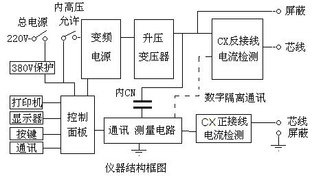 升壓變壓器:將變頻電源輸出升壓到測(cè)量電壓,最大無(wú)功輸出2KVA/1分鐘。